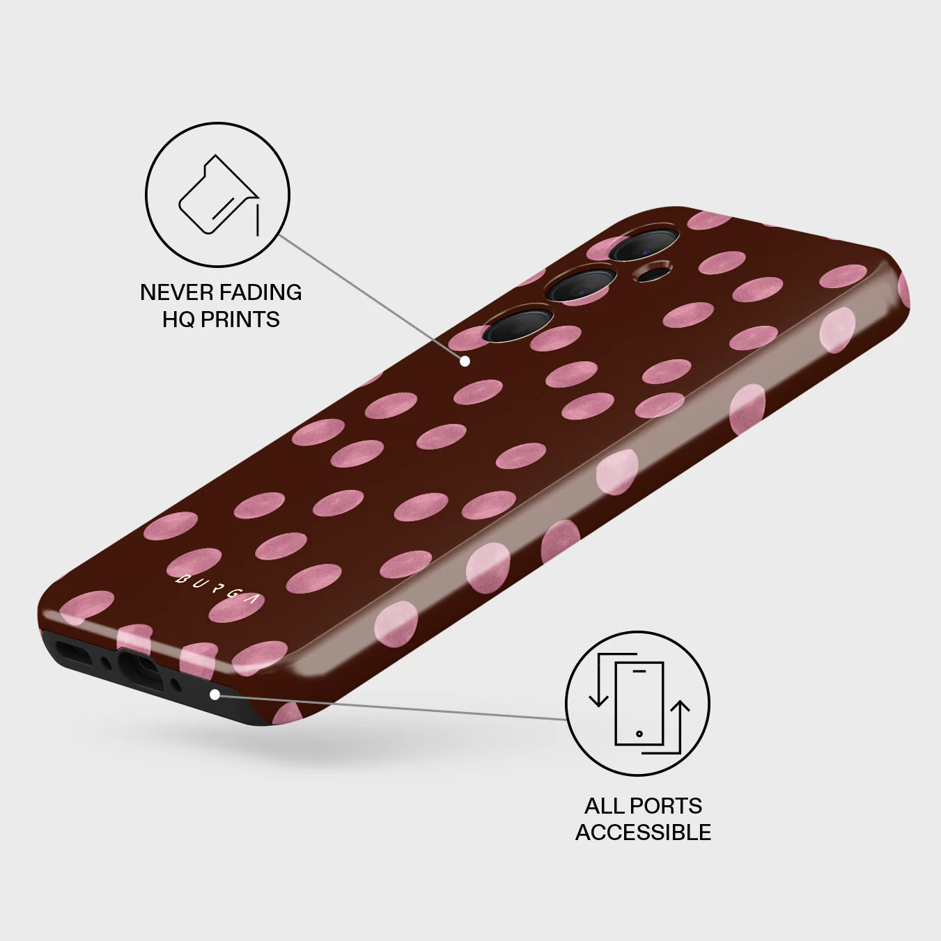 This design features: pink polka dots, brown background, dotted pattern