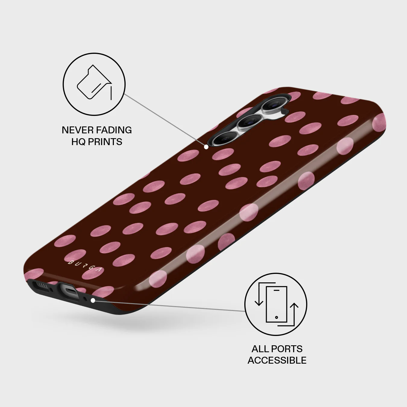 This design features: pink polka dots, brown background, dotted pattern