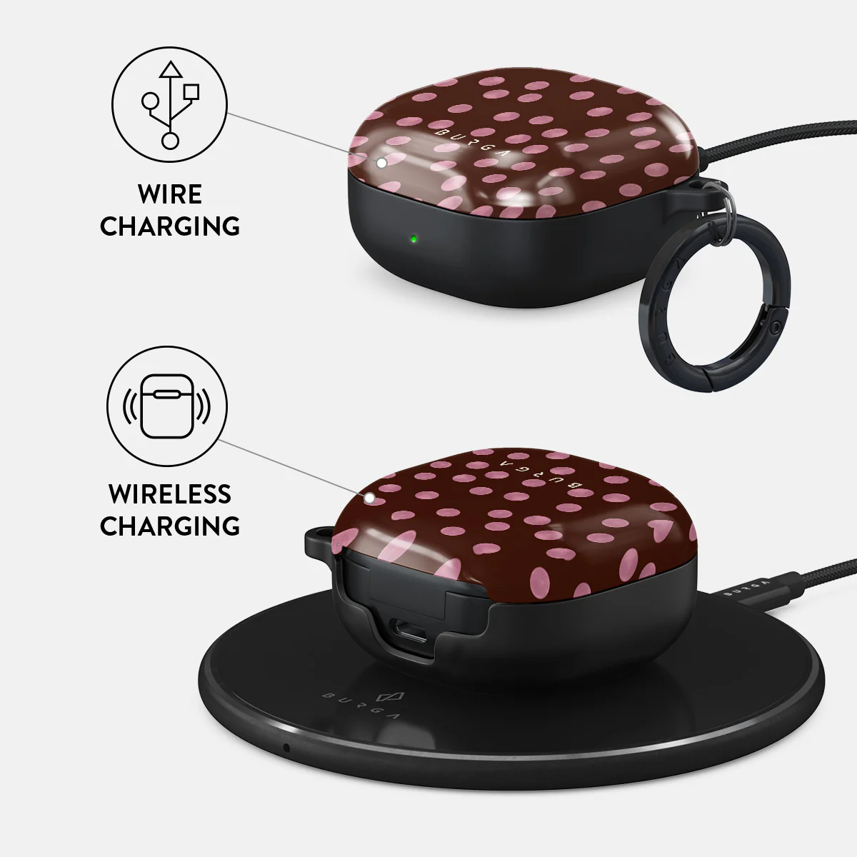 This design features: pink polka dots, brown background, dotted pattern